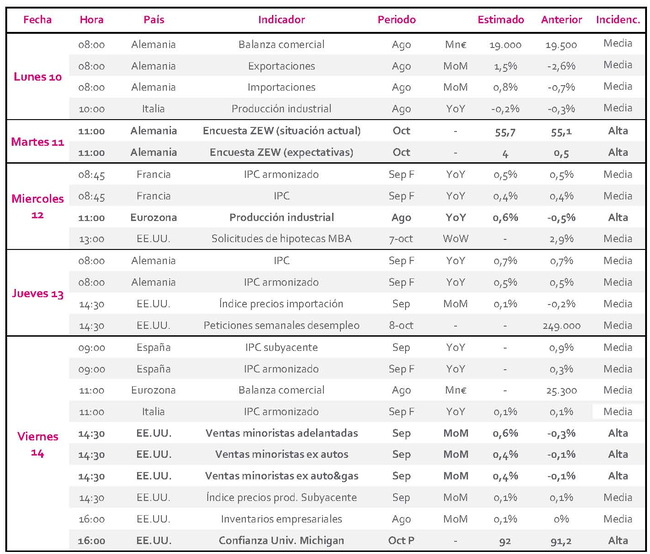 Semana sin muchas referencias macroeconómicas en Europa. El lunes dispondremos de las exportaciones e importaciones registradas en Alemania durante el mes de agosto, así como la producción industrial en Italia.